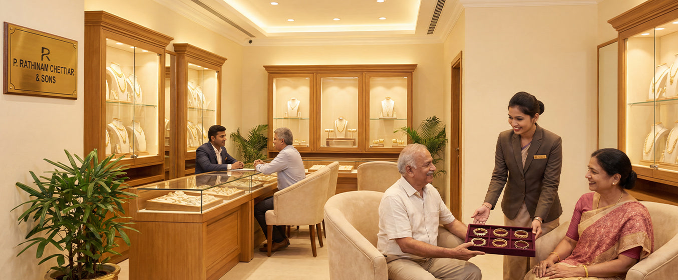 At P.Rathinam Chettiar & Sons, shopping for jewellery is more than apurchase — it’s an experience to be remembered. Our showroom offers a welcomingatmosphere where customers can explore, discuss, and customize designs with thehelp of our friendly team. From concept to creation, we ensure personalattention and complete transparency at every step, making each visit a joyfuland confident one.